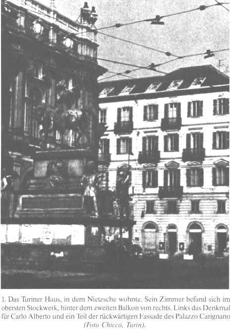 In Turin im Januar 1889 gewann der Wahnsinn Macht über Nietzsche. Er schrieb die berühmten "Wahnsinnsbriefe" an Cosima Wagner, Burckhardt und andere, umarmte auf offener Straße ein Pferd. Einige Tage später holte ihn Overbeck zurück nach Deutschland. Was aber geschah in der Zeit zwischen dem Zusammenbruch und Overbecks Ankunft? Hartmut Langes Erzählung vergegenwärtigt diese tragische Episode. M eine Adresse weiß ich nicht mehr: Nehmen wir an, daß sie zunächst der Palazzo del Quirinale sein dürfte."![]() Das letzte, dessen er sich erinnern konnte, war ein Gefühl, unaufhörlich zu wachsen, ein Gehoben-Werden jenem Licht zu, das er vom Engadin her kannte. Es war ein inwendiges Ausufern ins Unendliche, und doch konnte er von der Vorstellung nicht lassen, bei aller Entfesselung, die der Geist an ihm vornahm, auf irgendeine Weise gekreuzigt zu sein. Zwei Tage vorher war er noch mit irdischen Verwicklungen beschäftigt, er spürte dieser und jener Fährte nach, die seine Existenz zu bestätigen schien. Es waren Nachrichten aus Paris, Kopenhagen, St. Petersburg, aber sie konnten ihm, dem Verhungernden, keine Nahrung mehr zuführen, und so schrieb er jenen denkwürdigen Satz: "Ich halte ernsthaft die Deutschen für eine hundsgemeine Art Mensch und danke dem Himmel, daß ich in allen meinen Instinkten Pole und nichts anderes bin." ![]() Die Ansicht des Platzes heute Man schrieb die ersten Januartage des Jahres 1889. Das Wetter in Turin war strahlend, aber doch von jener Gebrochenheit, die dem italienischen Himmel aufgenötigt wird, wenn die Sonne den Horizont nicht mehr hinter sich lassen kann. Die Enge des Zimmers, das ihm zugewiesen worden war, deprimierte ihn nicht mehr, da alle Dinge, die er wahrnahm, aus ihm selbst zu kommen schienen, so auch die nachlässigen Handreichungen des Cameriere während der täglichen Mahlzeit und die Blicke der Passanten, wenn er die Straße zur Osteria überquerte. ![]() ... und ein Blick auf seine Wohnung Er war nun gesichert. Er war in der Zuversicht, Gott zu sein, Ursprung und Einheit aller Dinge, und er war entschlossen, von dieser Zuversicht Gebrauch zu machen, wann immer es ihm beliebte. Denn dieses Belieben war es ja, nach dem er sich gesehnt hatte, wenn die Dinge um ihn her sein Selbstgefühl auf hartnäckige Weise in Frage gestellt hatten, sodaß er gezwungen war, dem vorzubeugen, indem er sich in vollkommener Einsamkeit, den Blick auf Schneefelder gerichtet hoch in die Lüfte erhob, in der Hoffnung, man würde soviel Auftrieb letzten Endes doch anerkennen müssen. Und wie oft war er gezwungen, wenn diese Anerkennung ausblieb, am eigenen Bewundern ein Genüge zu haben! Nun brauchte er keine Bewunderung mehr, er war die Bewunderung selbst. Briefe waren noch zu schreiben, Botschaften übermütiger Gelassenheit, Nachrichten darüber, daß er alles, was ihn sterblich und also verwundbar machen konnte, hinter sich gelassen hatte. "Ah, Freund! welcher Augenblick! – Als Ihre Karte kam, was tat ich da ... Es war der berühmte Rubicon..." Er ging die vier, fünf Schritte in seinem Zimmer auf und ab wie jemand, der sich darin gefällt, nicht durch die Wände zu gehen. Die Stiege nahm er behutsam, mit durchgedrückten Knien, den Kopf hoch erhoben, er hätte fliegen können, aber dies wäre ihm billig erschienen. Und so ging er auch die Straße entlang, Schritt für Schritt, jedem Hindernis fast bis zur Umständlichkeit ausweichend. Er wollte die Passanten bitten, ihr zustimmendes Lächeln zu unterlassen, ihm fiel aber immer wieder rechtzeitig ein, daß er es selbst war, der sich begegnete, oder daß zumindest die Dinge den Schein ihrer Unabhängigkeit nur wahren konnten, weil seine Bescheidenheit es verlangte. Dies hatte er notiert, aber nun war auch diese Notiz der Post übergeben. Vor dem Palazzo Carignano sah er in das Gewimmel, und während er prüfte, ob es der Mühe wert war, diese Ansammlung menschlicher Unerheblichkeiten erschaffen zu haben, entdeckte er ein Pferd und wie dieses, da der Karren, den es ziehen sollte, zu schwer war, auf den vorderen Hufen ausrutschte, und wie der Kutscher, erbittert vor Wut, mit einer Peitsche auf die Kreatur einschlug, und wie sie bei jedem Versuch, das Unmögliche, das man von ihr erzwingen wollte, doch noch zu leisten, hoffnungsloser und endgültiger auf den Knien zusammenbrach. Es war ein Bild des Jammers. Er ging auf den Kutscher zu und wollte ihn energisch zurechtweisen, wie er dazu käme, ein Tier, das in jeder Hinsicht höher stünde als er, derart zu quälen, und ob er nicht wisse ... Aber plötzlich schien ihm das Gefühl der Allmacht, jenes Ausufern ins Unendliche wie das Spannen einer Feder, die, je mehr man sie dehnt, an Kraft und Widerstand zunimmt, bis sie jenen Zustand erreicht, wo sie zurückschlagen muß. Er konnte den Blick von der Peitsche nicht mehr wenden, das verzerrte Gesicht des Fluchenden, dieses unnachgiebige, bis in den äußersten Willen angestrengte Wüten, bäumte sich vor ihm auf wie eine Wand. Nun sank sein Mut, der eben noch die Grenzen überstiegen hatte, ins Unerhebliche. Er begann zu schluchzen, warf sich dem Pferd um den Hals, wobei er ins Stolpern kam, und als einige Männer ihn fassen wollten und als auch der Kutscher, ernüchtert durch die überfallartige Verzweiflung des Fremden, ihm hilfreich die Hand reichte, stieß er Schreie der Empörung aus. Er verfluchte die Welt, nannte das Tier seinen Bruder und hing noch haltloser, noch unlösbarer mit dem Pferd verbunden, an dessen Hals, und jeder sah, daß hier jemand ein für allemal die Fassung seines Lebens verloren hatte. Man brachte ihn auf sein Zimmer. Er war immer noch außer sich, konnte aber die Fragen, die man ihm nach Herkunft, Alter, Beschäftigung stellte, klar beantworten. Überhaupt schien es unnötig, sich um ihn, der immer wieder versicherte, er brauche Schlaf, einen tiefen, ausgiebigen Schlaf, sonst nichts, weiter zu kümmern. Eine halbe Stunde später lag er mit weit von sich gestreckten Armen reglos da, er